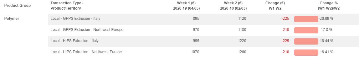 As can be seen from ChemOrbis Product Snapshot below, GPPS and HIPS ext. prices in Italy and Northwest Europe saw cumulative decreases of $210-225/ton since early March.